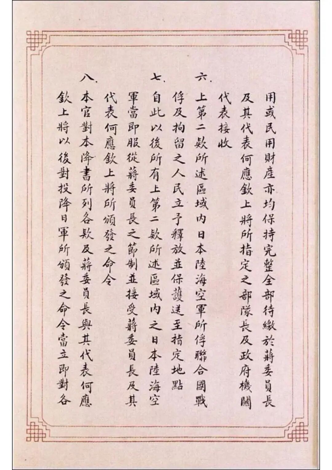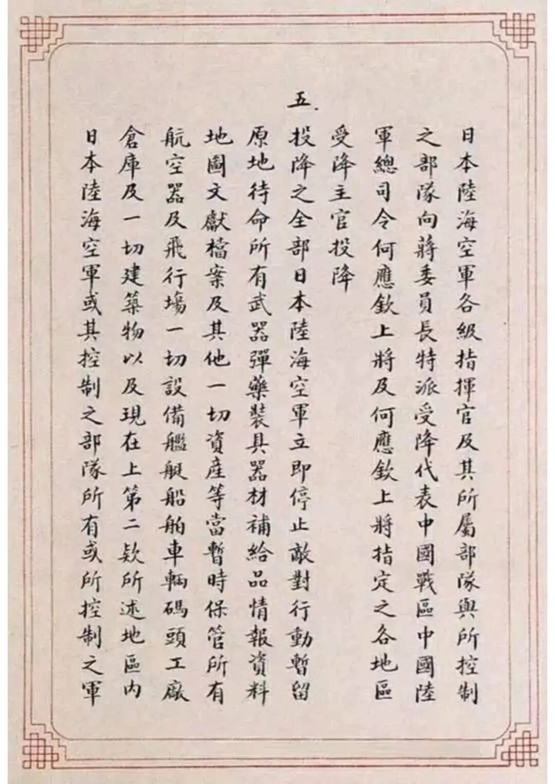 二、联合国最高统帅第一号令规定”在中华民国(东三省除外)台湾与越南北纬十六度以北地区内之日本全部陆海空军与辅助部队应向蒋委员长投降“