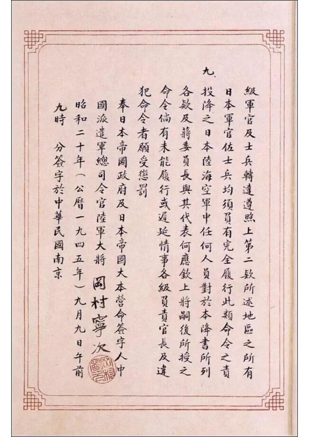 三、吾等在上述区域内之全部日本陆海空军及辅助部队之将领愿率领所属部队向蒋委员长无条件投降