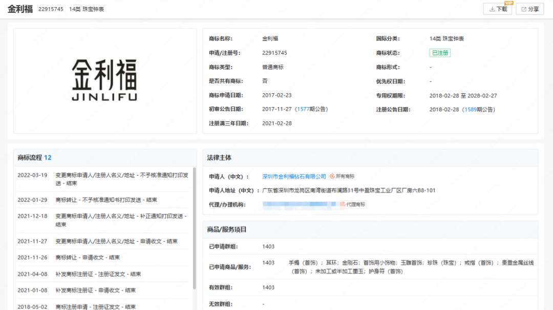 深圳市金利福钻石有限公司成立于2004年,有着深厚的背景和丰富的行业经验,多年来一直专注于珠宝行业,如今在市场上占据一席之地,其名下的第14类“金利福”商标更是在业内有着不小的名气。