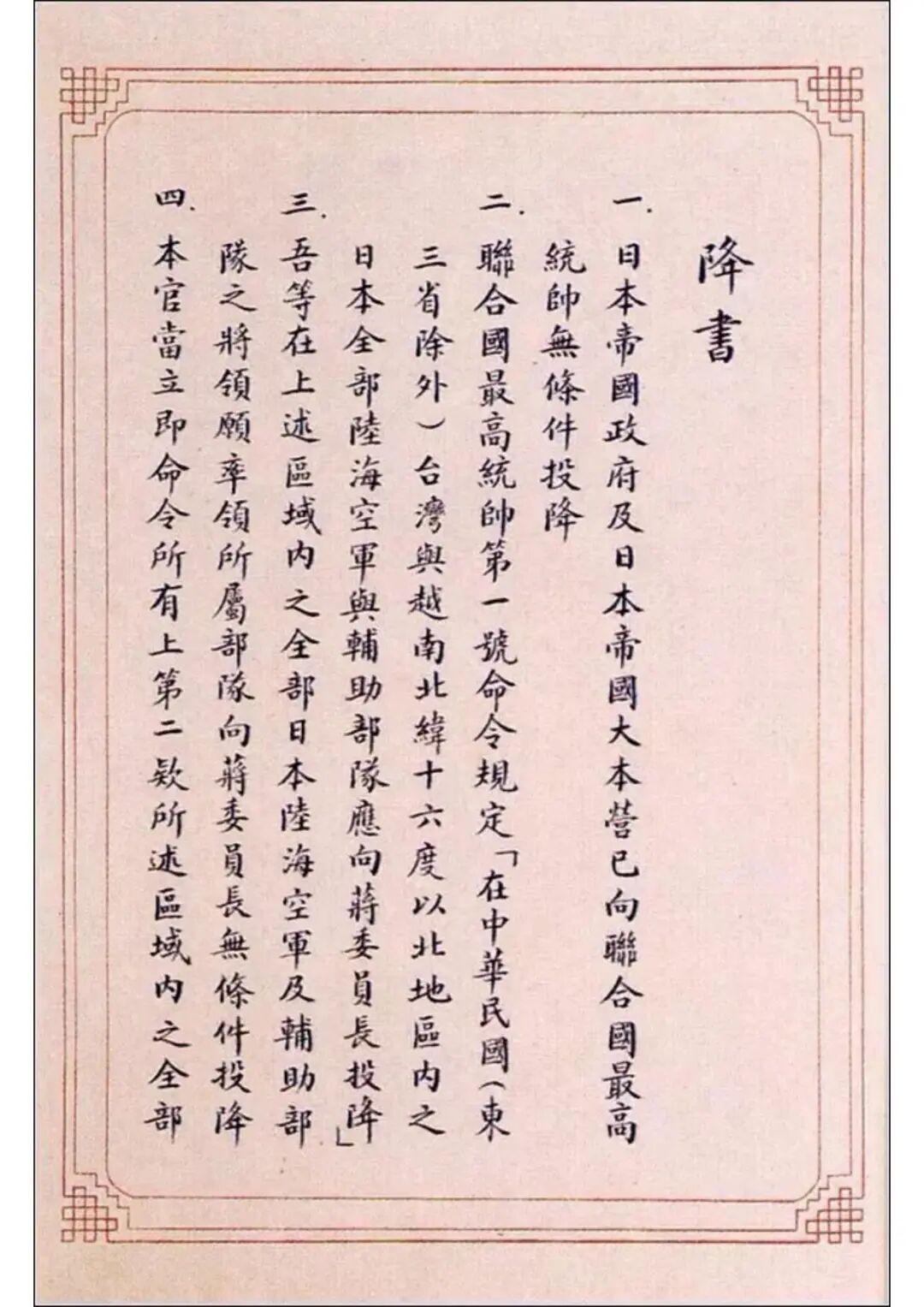 二、联合国最高统帅第一号令规定”在中华民国(东三省除外)台湾与越南北纬十六度以北地区内之日本全部陆海空军与辅助部队应向蒋委员长投降“